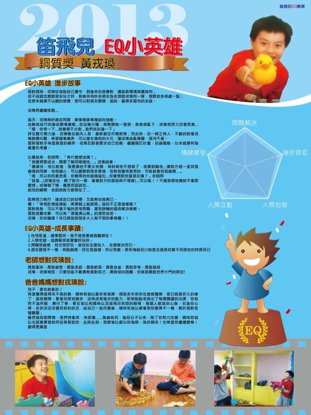 兒 子,首先恭喜你!再度獲得這得來不易的獎,媽咪和爸比都非常高興,想起多年前你也曾經獲獎,那已經是好久的事了,這段期間,看著你原地踏步,沒有成長進步 的動力,即使點點老師出了每週閱讀的功課,你依然不為所動,應付了事,看在爸比和媽咪以及笛飛兒老師的眼裡,每個人都為你心急,也為你心疼,在你決定改變 目前的狀況,給自己一些改變後,媽咪和爸比都看到你變得不一樣,勇於面對各種難題;雖然這段期間裡,我們有衝突,有悲傷……無論如何,這段日子以來,除了你努力改變,媽咪和爸比也認真學習如何從旁幫助你,此時此刻,我跟爸比都以你為榮,為你喝采!也希望你繼續變棒!變得更厲害!