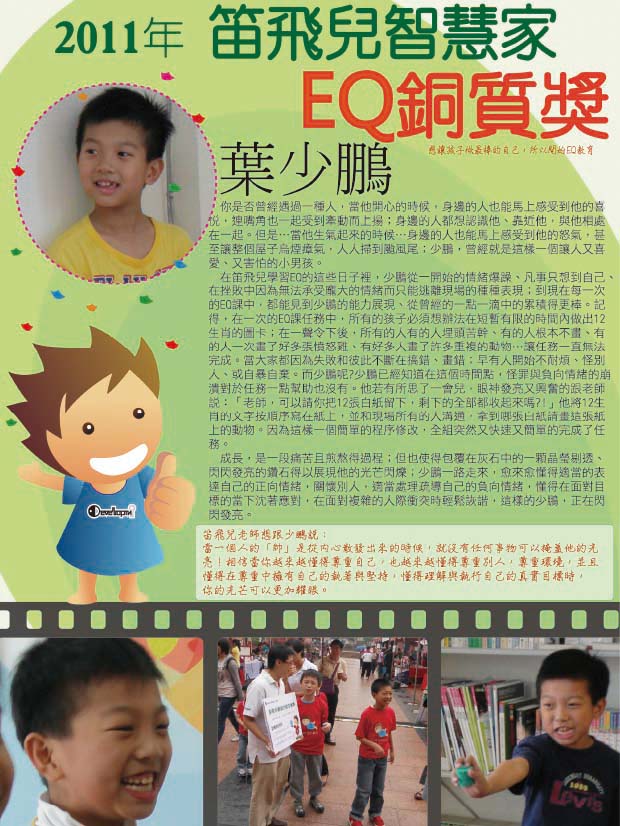 在笛飛兒學習EQ的這些日子裡,少鵬從一開始的情緒爆躁、凡事只想到自己、在挫敗中因為無法承受龐大的情緒而只能逃離現場的種種表現;到現在每一次的EQ課中,都能見到少鵬的能力展現、從曾經的一點一滴中的累積得更棒。