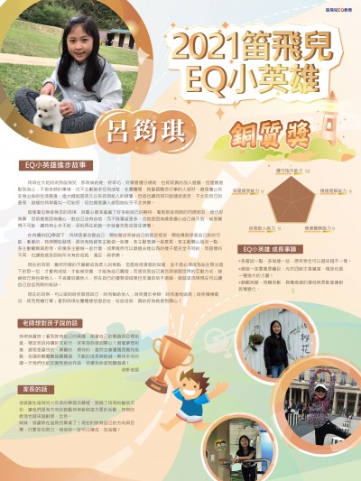 筠琪大班開始加入笛飛兒,當時的她是一個盲目遵守指示的、總是擔心他人評價的小女孩,在持續的EQ學習後,逐步提升自信、勇於突破、穩定自我,插畫天賦也跟著萌芽與茁壯。