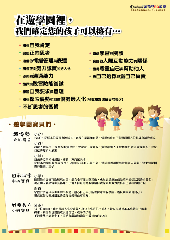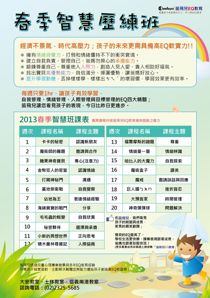 2013 笛飛兒EQ教育 智慧歷練班 新春開課嚕! 02/16(六)起,各教室全面開課中, 歡迎想和笛飛兒一起提升高EQ、做最棒自己的寶貝們, 至各教室(士林、大安、信義南港)體驗課程唷! 體驗當天, 現場打卡按讚,成為笛飛兒粉絲團一員,皆享單次體驗的優惠價格唷!