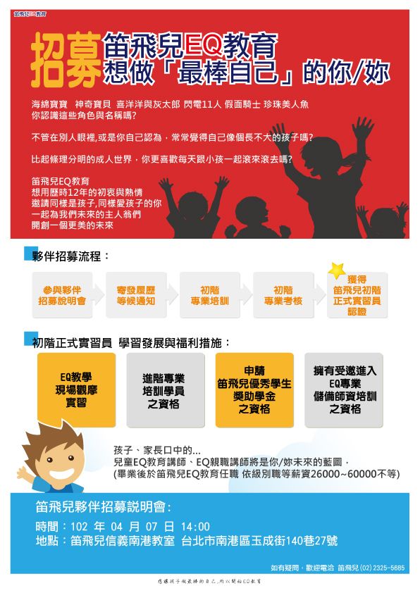 想和笛飛兒一起做最棒的自己嗎? 笛飛兒EQ教育 想用歷時12年的初衷與熱情 邀請同樣是孩子,同樣愛孩子的你 一起為我們未來的主人翁們,開創一個更美的未來! 歡迎將您的履歷寄至笛飛兒信箱kiddeveloping@yahoo.com.tw