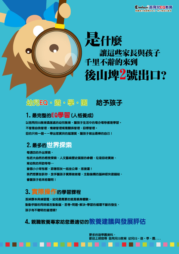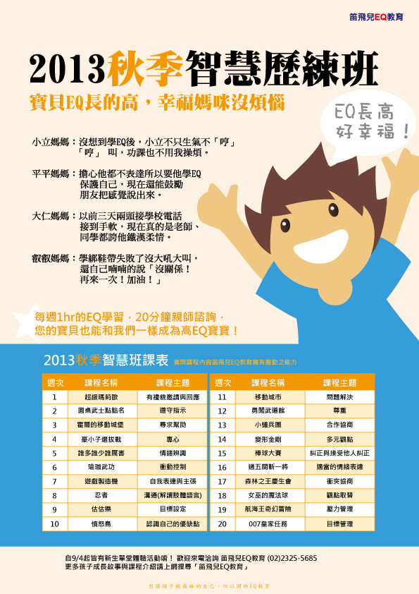 2013 笛飛兒EQ教育 秋季智慧歷練班 準備開課囉! 09/04(三)起,各教室全面開課, 歡迎想和笛飛兒一起提升高EQ、做最棒自己的寶貝們, 至各教室(士林、大安、信義南港)體驗課程喔! 體驗當天, 現場上Facebook打卡按讚,成為笛飛兒粉絲團的一員,就可享有單次體驗的優惠價格唷! 有任何問題都歡迎撥打課程專線:(02)2325-5685