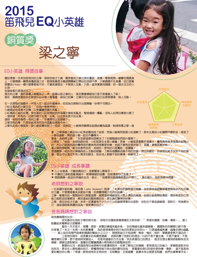親愛的女兒,經過笛飛兒老師兩年的教導與陪伴,你更了解自己的情緒,更相信自己的能力,更勇敢面對未知的狀況,更多在人際相處的技巧,更懂得控制不時出現的嬰兒自我, 更重要的是EQ好使你更快樂、勇敢, 這不就是我愛你最初的心嗎!?希望一路有我有你互相扶持、互相幫助、互相提醒,就算未來出現更多阻饒,我們也要牽著手走。