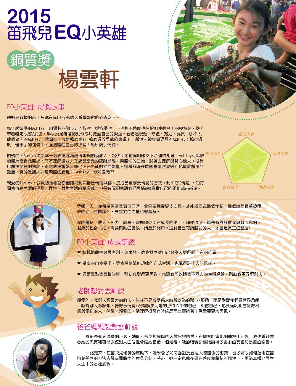 雲軒是個充滿愛的小孩,她從不吝於對周圍的人付出她的愛,在提早社會化的學校生活裏,我也曾經擔心她的天真和容易原諒別人的個性會讓她吃虧,但最後,她的特質卻讓她贏得了更多的友誼和長輩的關愛。
