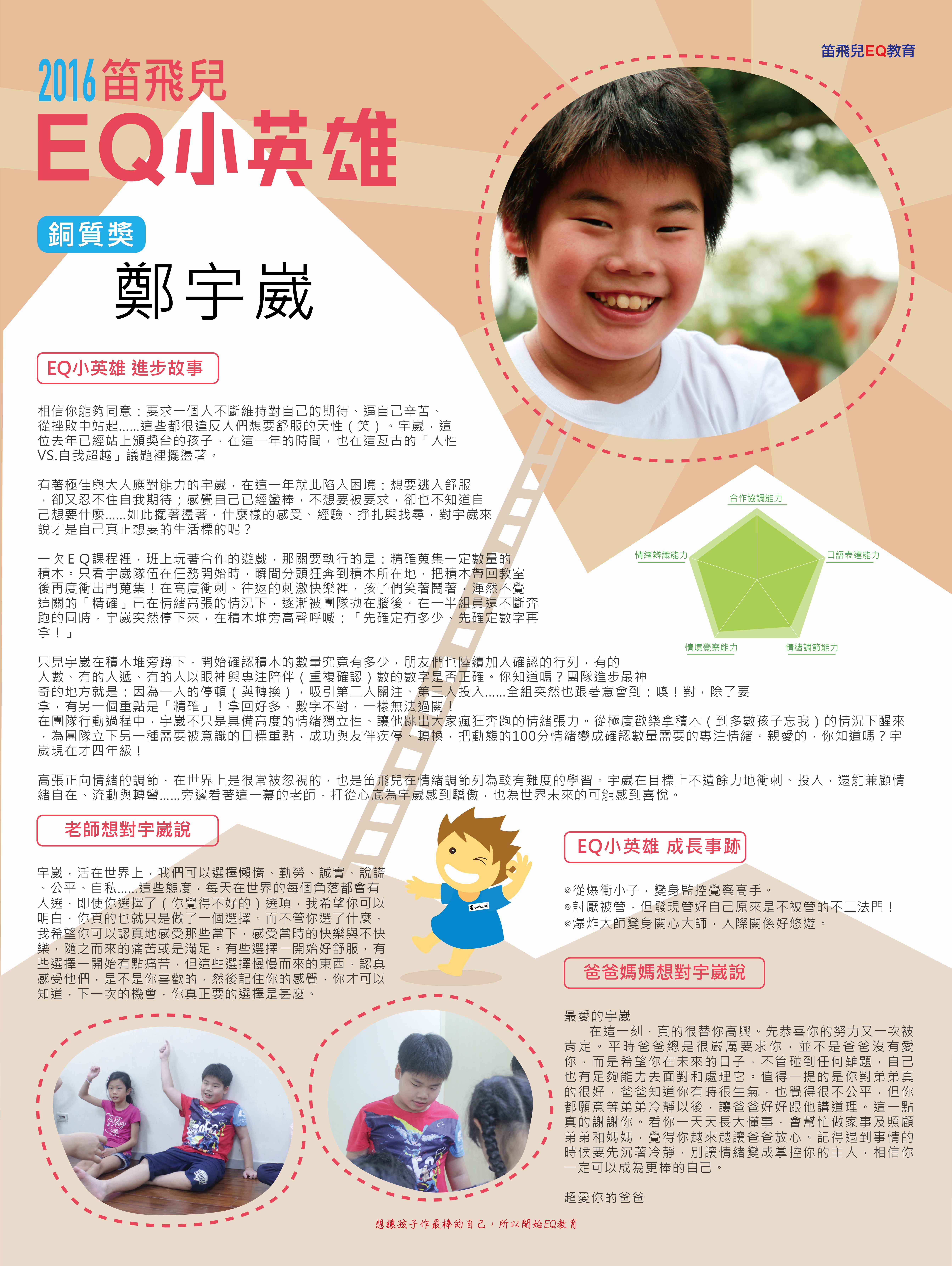 在這一刻,真的很替你高興。先恭喜你的努力又一次被肯定。平時爸爸總是很嚴厲要求你,並不是爸爸沒有愛你,而是希望你在未來的日子,不管碰到任何難題,自己也有足夠能力去面對和處理它。值得一提的是你對弟弟真的很好,爸爸知道你有時很生氣,也覺得很不公平,但你都願意等弟弟冷靜以後,讓爸爸好好跟他講道理。這一點真的謝謝你。看你一天天長大懂事,會幫忙做家事及照顧弟弟和媽媽,覺得你越來越讓爸爸放心。記得遇到事情的時候要先沉著冷靜,別讓情緒變成掌控你的主人,相信你一定可以成為更棒的自己。