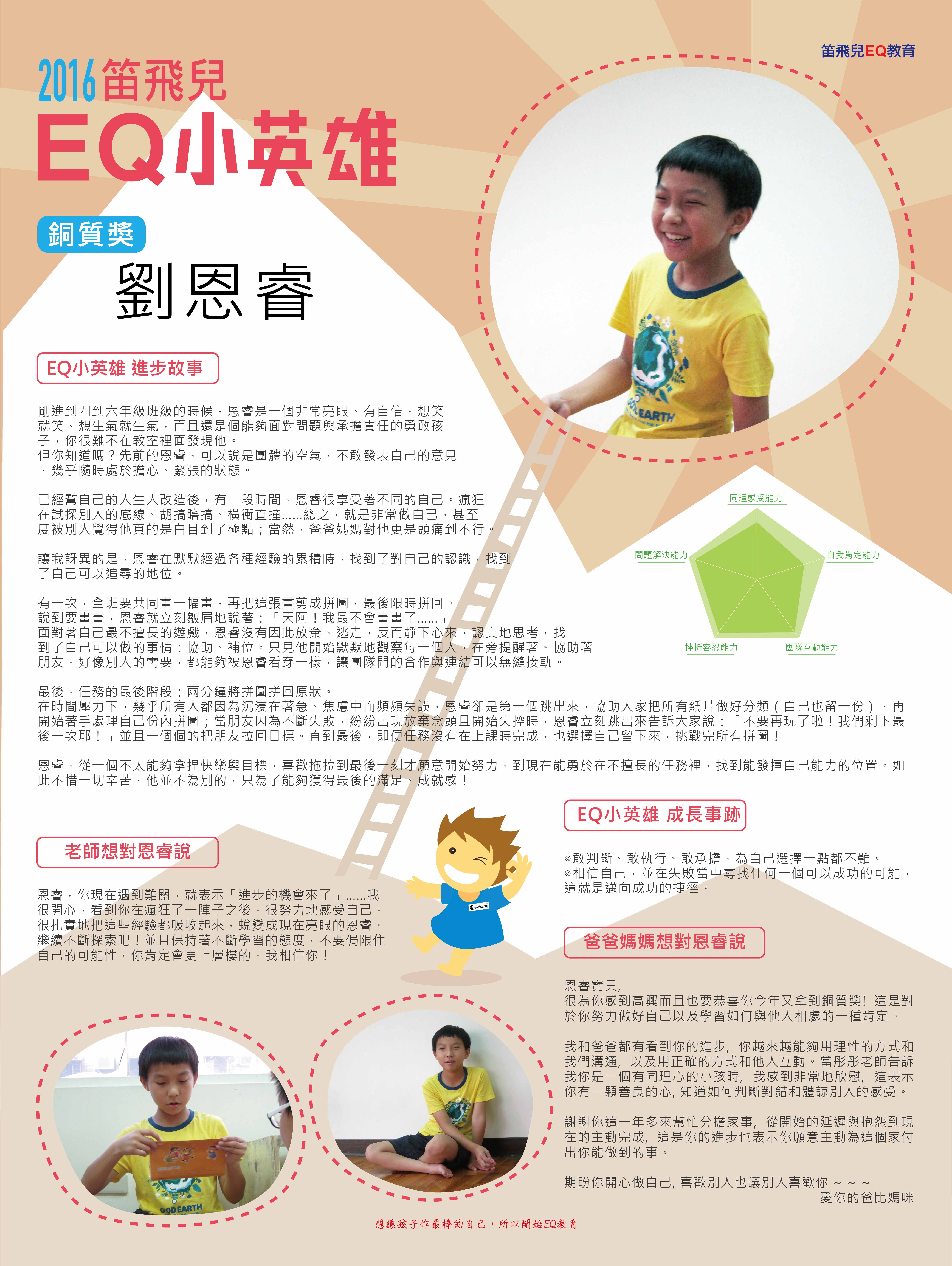 剛進到四到六年級班級的時候,恩睿是一個非常亮眼、有自信,想笑就笑、想生氣就生氣,而且還是個能夠面對問題與承擔責任的勇敢孩子,你很難不在教室裡面發現他。