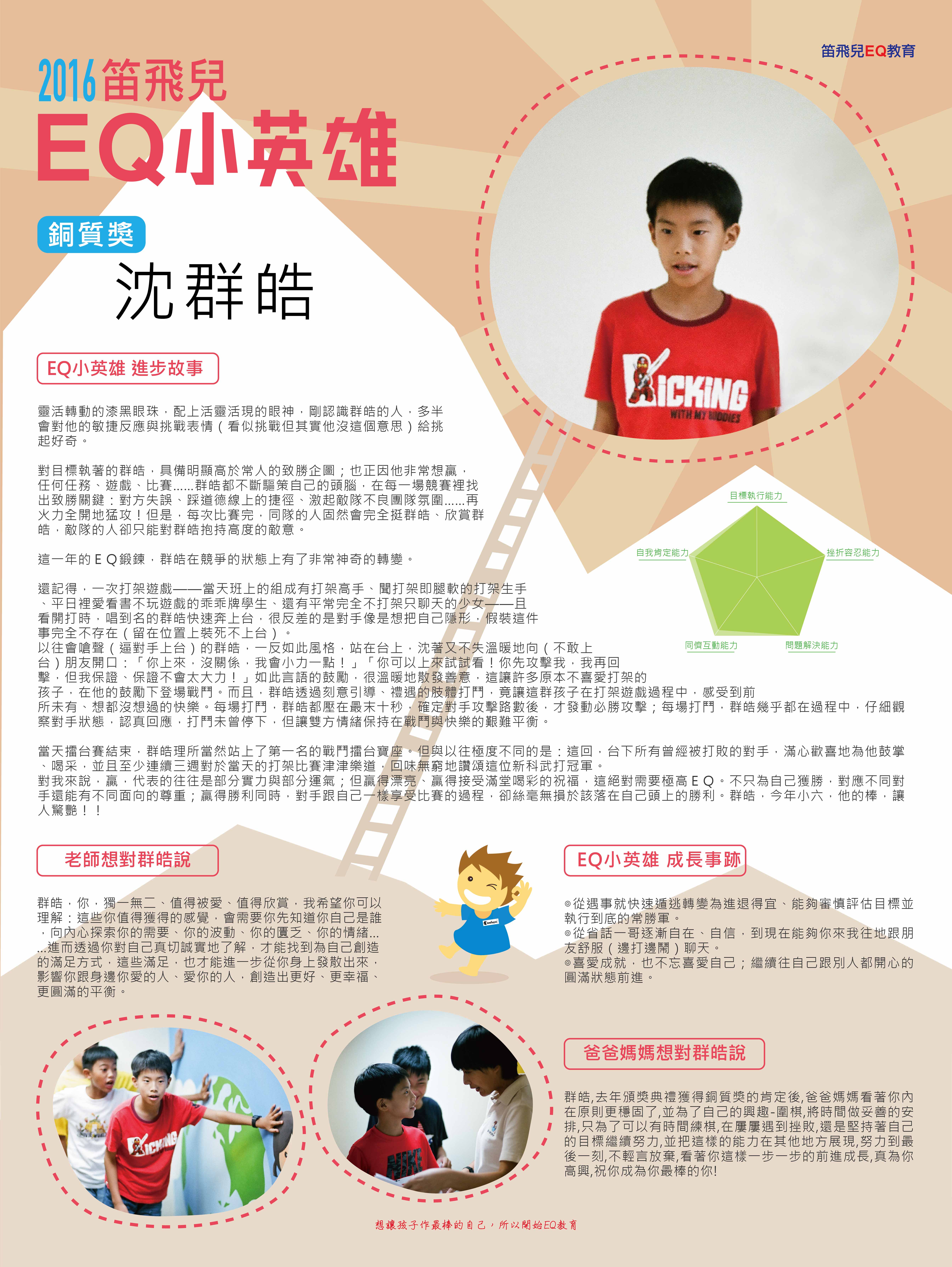 群皓,去年頒獎典禮獲得銅質獎的肯定後,爸爸媽媽看著你內在原則更穩固了,並為了自己的興趣-圍棋,將時間做妥善的安排,只為了可以有時間練棋,在屢屢遇到挫敗,還是堅持著自己的目標繼續努力,並把這樣的能力在其他地方展現,努力到最後一刻,不輕言放棄,看著你這樣一步一步的前進成長,真為你高興,祝你成為你最棒的你!