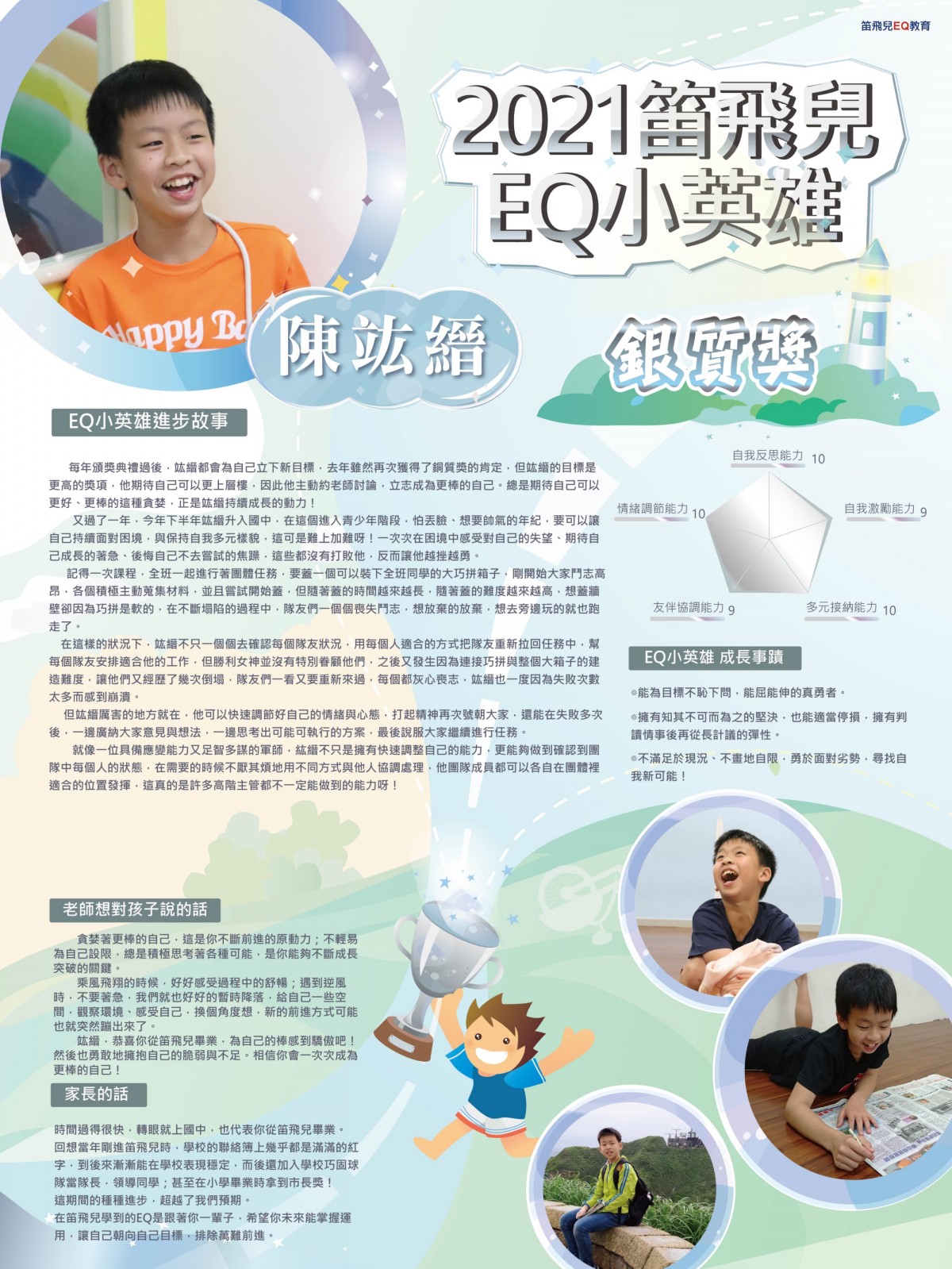 每年頒獎典禮過後,竑縉都會為自己立下新目標,去年雖然再次獲得了銅質獎的肯定,但竑縉的目標是更高的獎項,他期自己可以更上層樓,因此他主動約老師討論,立志成為更棒的自己。總期待自己可以更好、更棒的這種貪婪,正是竑縉持續成長的動力!又過了一年,今年下半年竑縉升入國中,在這個進入青少年階段,怕丟臉、
