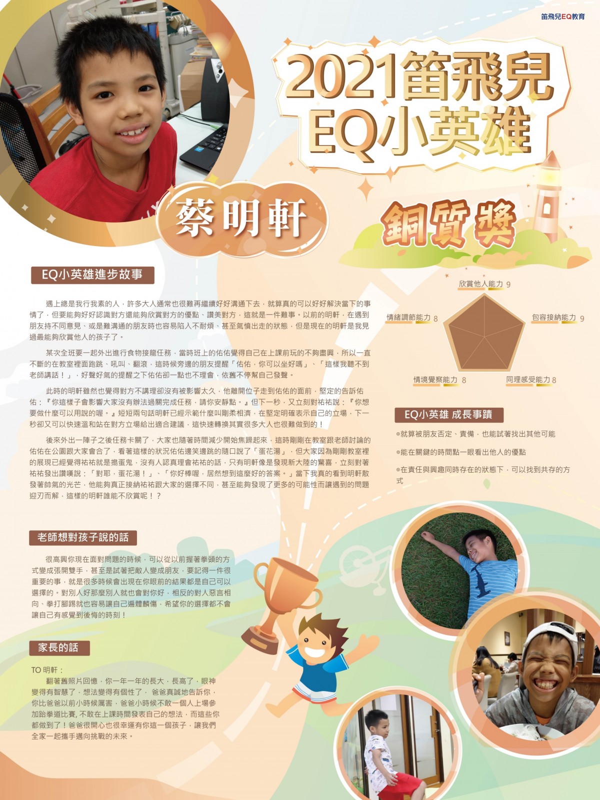 以前的明軒,在遇到朋友持不同意見、或是難溝通的朋友時也容易陷入不耐煩、甚至氣憤出走的狀態,但是現在的明軒是我見過最能夠欣賞他人的孩子了。