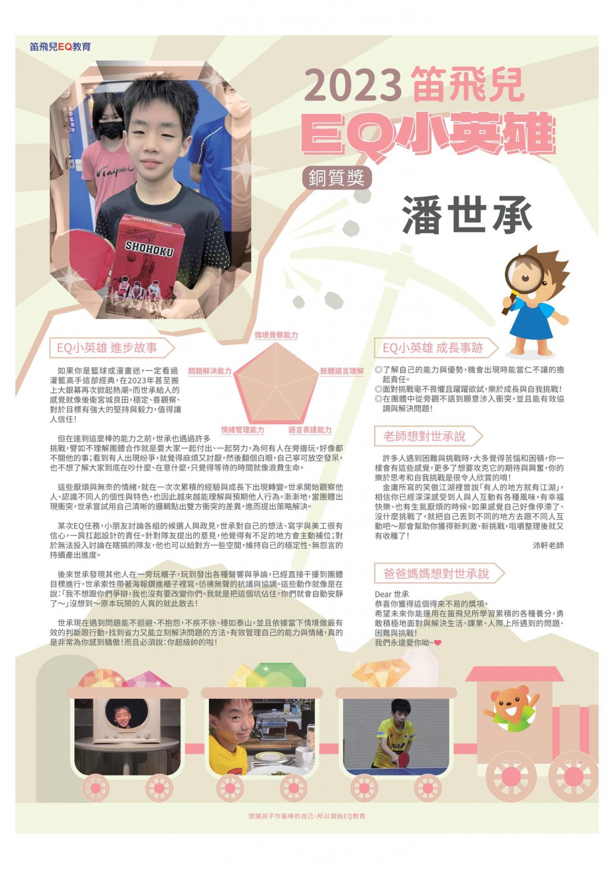 世承現在遇到問題能不迴避、不抱怨,不疾不徐、穩如泰山,並且依據當下情境做最有效的判斷跟行動,找到省力又能立刻解決問題的方法,有效管理自己的能力與情緒,真的是非常為你感到驕傲!而且必須說:你超級帥的啦!