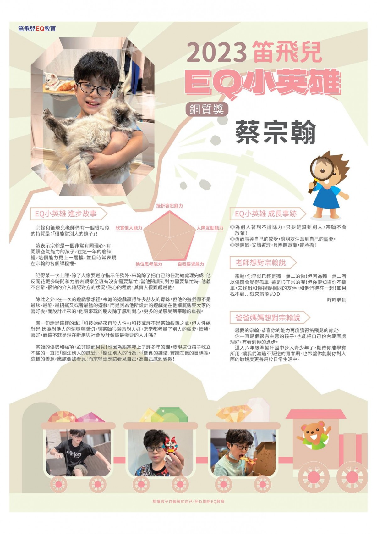 宗翰的優勢和強項,並非顯而易見,也因為跟宗翰上了許多年的課,發現這位孩子屹立不搖的一直把「關注別人的感受」、「關注別人的行為」、「關係的鏈結」實踐在他的目標裡,這樣的善意,應該要被看見!而宗翰更應該看見自己,為自己感到驕傲!