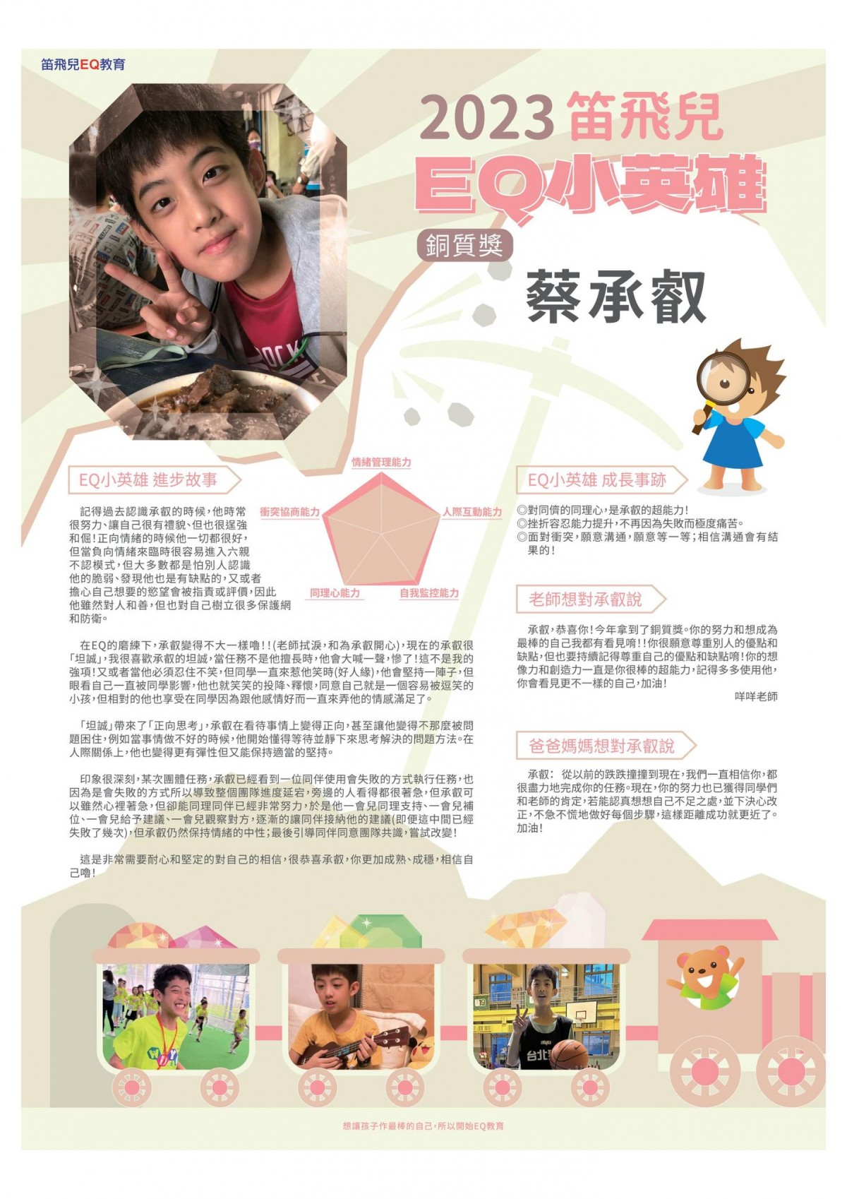在EQ的磨練下,承叡變得不大一樣嚕!!(老師拭淚,和為承叡開心),現在的承叡很「坦誠」,我很喜歡承叡的坦誠,當任務不是他擅長時,他會大喊一聲,慘了!這不是我的強項!又或者當他必須忍住不笑,但同學一直來惹他笑時(好人緣),他會堅持一陣子,但眼看自己一直被同學影響,他也就笑笑的投降、釋懷,同意自己就是一個容易被逗笑的小孩,但相對的他也享受在同學因為跟他感情好而一直來弄他的情感滿足了。