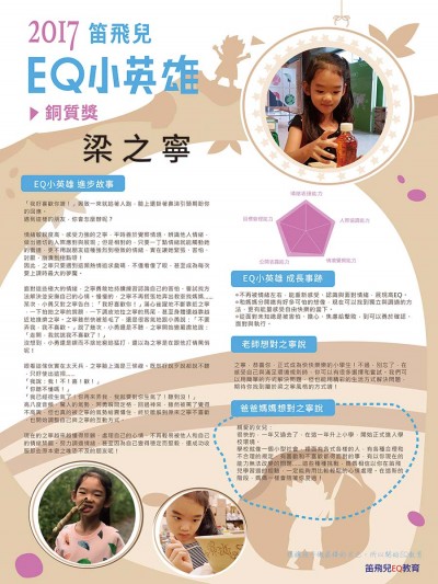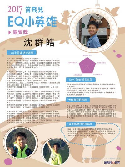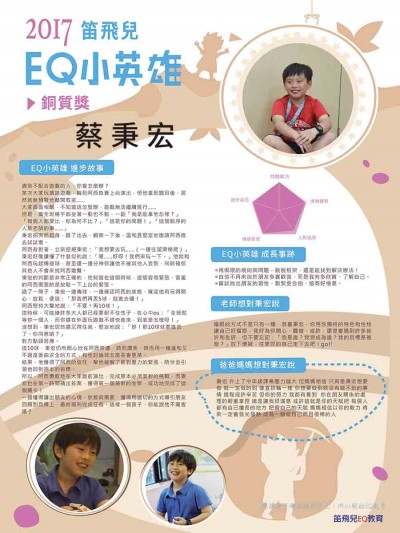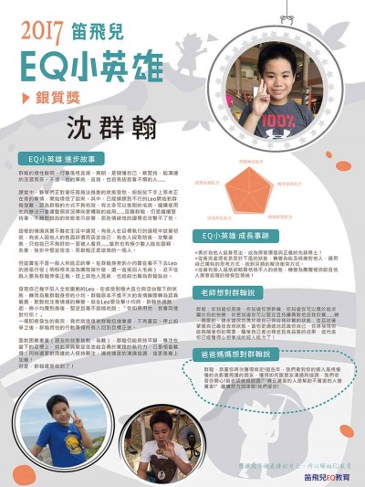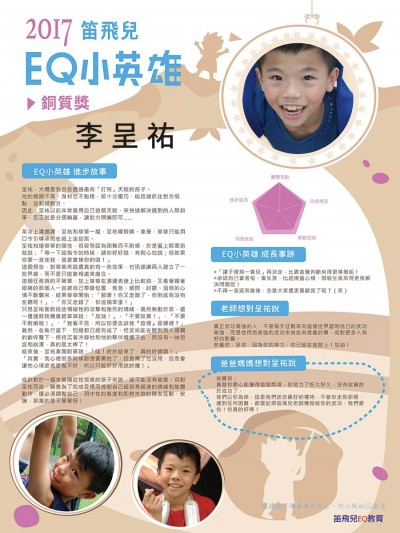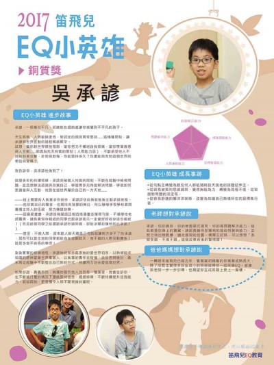 承諺,一個看似平凡,卻總能在細節處讓你感覺到不平凡的孩子。 天生固執、人際敏銳度低、對認定的規則異常堅持……這種種限制,讓承諺與世界互動的過程備感艱辛。 試想,當你對世界懷抱理想、當你努力不懈地自我修煉、當你帶著善意與人互動……卻因為先天特質的限制(人際能力弱),不斷承受他人不時的刻意攻擊、針對與欺侮,你能堅持多久?你還能保有對這個世界的相信與愛嗎? 我告訴你,吳承諺他做到了! 這麼多年的持續修練,承諺突破個人特質的限制,不斷在經驗中檢視問題,並且想辦法認識與欣賞自己,學習用多元角度解決問題、學習如何更適當與人互動,找到在這世界屬於自己的一方天地…… ——班上需要有人負責手作勞作,承諺評估自身狀態後主動承接班務。 ——他欣賞自己的聲音,也期待有發揮的舞台,所以積極爭取學校晨間廣播主持人的任務,努力傳遞快樂。 ——因喜愛畫畫,承諺投稿國語日報四格漫畫並獲得刊登,不僅學校老師嘉獎,連負責保存報紙的同學也跟承諺表示一定會好好收存這份報紙!(而且這個同學之前還跟承諺吵過架喔,卻能冰釋前嫌地如此承諾!) ——甚至,不善人際,原本跟人聊天總是三句話就讓對方受不了的承諺,居然可以跟全班的同學都能自在地聊起天,有不錯的人際互動關係!這是多麼不容易的事呀! 紮紮實實的修練過程,承諺始終保持最原始的愛世界初衷,以熱情追求知識的眼神望著世界看著人,以執著的實作去碰撞、去反思與檢討,最末再從經驗中不斷整合自己新的方式,持續用力地去愛這個世界。 如果你說,轟轟烈烈、絢爛地吸引他人注目是一種厲害,我會告訴你,在不斷被打壓的情況下還能堅持信念、細細修練,不斷持續提升自我能力、超越限制,更是種令人移不開視線的耀眼。 老師給孩子的話 承諺,你的善良、你的無厘頭式搞笑、你的高問題解決能力,這些都是你身上的寶藏。請認真善待你擁有的這些特質與能力,並努力找出相對應、適合展現的位置。偶爾忘記時,可以想想「多做多錯、不做不錯」這個故事背後的警惕喔! 家長的話 一轉眼來笛飛兒已經五年,看著當初稚嫩的你漸漸成熟長大,除了欣慰也覺得幸好在很小的時候就帶你一起來學EQ。感謝笛老師一步一步引導,也期望你在成長路上更上一層樓。 【網頁訊息並非全部得獎學生,部分得獎者因不同意公開因此無展示】