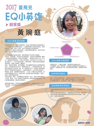 帶著黝黑的大眼,俏皮可愛的臉蛋,再加上到新環境的快速適應能力,以及面對人際的積極主動性,「感覺跟每個人都能成為朋友」就是琬庭給人的第一印象。但是,這可不是琬庭天生就會的喔。 你能想像嗎?剛踏入笛飛兒的她,也曾經是個有點怕生,對自己沒有自信,不太敢行動的小女孩呢! 現在的琬庭能有這樣的亮眼,真的是經過了許多努力與蛻變。 記得有一次的遊戲,全班孩子玩著躲避球,但因為分組問題陷入膠著,遲遲無法開始遊戲,只見元元抗議著:「厲害的人都在一組,不公平,這樣哪玩得起來呀,不換人就不開始!反正根本分不公平啦!大家不要玩了!」元元不斷地抗議、不斷地抱怨,搞得全班的氣氛都變得好緊張、兩組人馬衝突一觸即發。 這時,琬庭沒有閒著,她仔細觀察、努力動腦思考如何化解這緊張的狀況。只見琬庭先走向元元,輕聲告訴元元:「我知道你很生氣,很會打躲避球的人都在同一隊,你一定覺得不公平,其實你只是希望遊戲可以不要這麼快結束對吧!」聽完琬庭的話,元元突然冷靜許多,點點頭;接著,琬庭轉身告訴全班:「大家,其實元元沒有惡意,他只是希望遊戲可以玩久一點而已啦!這其實也是大家想要的,對吧!我們一起想想看辦法吧!」 只因為琬庭一席話,全班瞬間從互相抱怨、對立,變成冷靜與願意投入討論,最後,大家一起想到了能讓所有人都同意與滿意的解法,成功地讓遊戲繼續,讓全班玩得盡興。 這衝突看似單純,但如果沒有琬庭主動觀察,試著站在每個人的立場思考問題,找出團隊共同可以前進的方向,衝突十之八九會越演越烈,對吧? 老師想對孩子說的話 琬庭,我們活在這個世界上,會跟許許多多不同特色的人相處,但你千萬不要忘記一件事:每個人都是獨特的!你不會成為別人,也不需要成為別人!做你自己,成為一個獨一無二的黃琬庭! 家長的話: 恭喜妳通過笛飛兒的評鑑,證明妳跨越了上一個黃琬庭 ,升級囉~ 現在的妳開始懂得尊重自己、誠實面對自己的心情,這樣的妳真的好棒喔!希望妳繼續勇敢並快樂地面對未來的挑戰,相信自己,爸媽永遠愛妳喔。