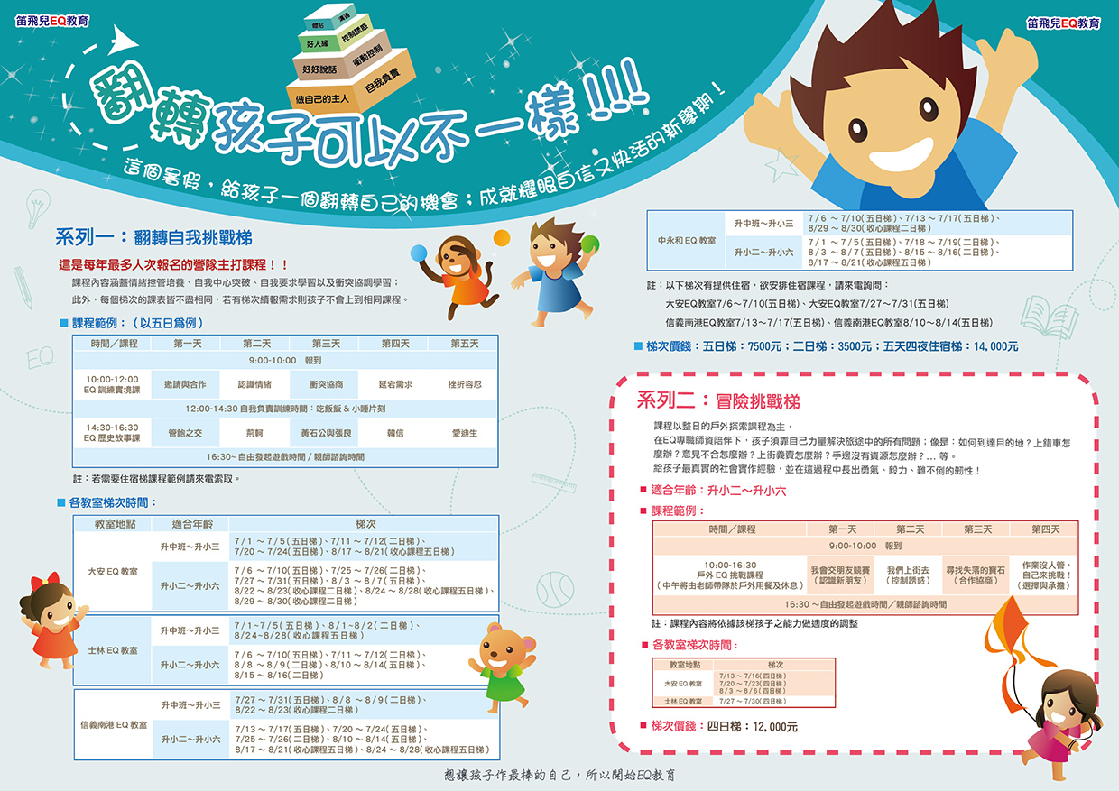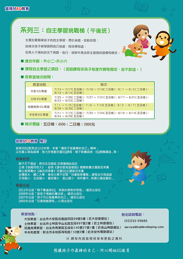 2015暑假 寶貝翻轉自我挑戰營 課表出爐囉!! 困境,壓著寶貝喘不過氣嗎? 挫折,導致孩子的光芒被覆蓋了嗎? 今年暑假,笛飛兒要讓孩子動起來,搬開壓在身上的困境與挫折! 詳情請點選圖片連結唷 🙂 eqedu 2017-06-28T10:57:59+08:00