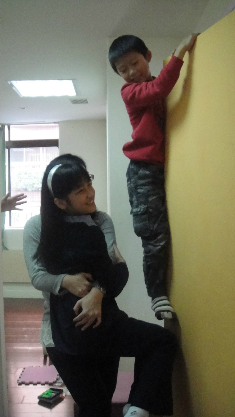 爬這麼高在做什麼呀?是…模仿蜘蛛人做飛簷走壁?喔~原來今天的任務是「挑戰不可能」,向天花板更靠近;不過…動動腦外還要記得保護自己的安全,所以在往上爬時還要先為自己尋找安全的協助與辦法唷!最後,目標完成了、安全也都顧到啦!今天的挑戰不可能,成功!(過程中皆有老師一旁陪同,爸爸媽媽別擔心喔!)