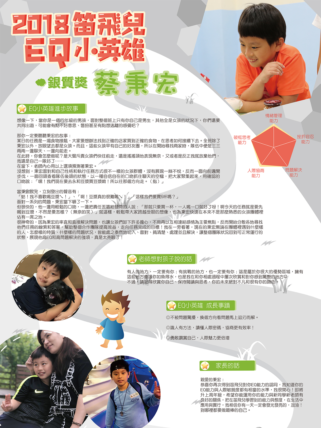 親愛的秉宏:恭喜你再次得到笛飛兒對你EQ能力的認同,我知道你的EQ能力與人際敏銳度都有相當的水準,我很開心!即將升上高年級,希望你能運用你的能力與新同學新老師有良好的關係,把在笛飛兒學習到的能力與態度,在生活中應用與實行,我相信你有一天一定會發光發亮的,加油!到哪裡都要做最棒的自己。