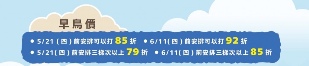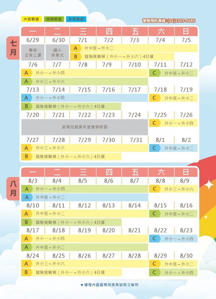 | B 冒險挑戰梯 (戶外探索營隊課程) | ▲以全日戶外探索課程為主,給孩子最真實的社會實作歷練,從中幫助孩子長出勇氣、毅力和應變力;提升社會適應力與不被問題難倒的軟實力。 ▲每日課後親師諮詢,追蹤孩子營隊課程的展現,親子EQ共學習。 ▲營隊結業當天將頒發EQ結業證書,並總結孩子學習成果,給孩子滿滿的正向回饋與對自我覺察學習的成就感。 | $17550元 |